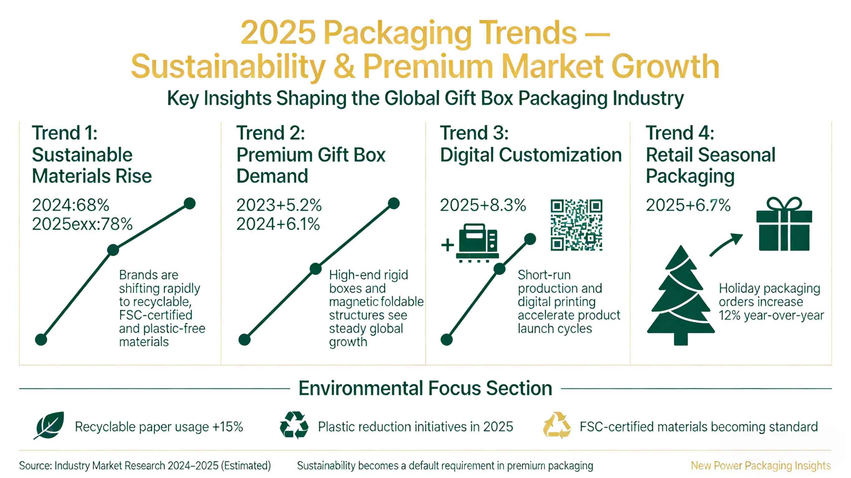 Prévisions des études de marché : Le marché des coffrets cadeaux haut de gamme maintiendra une croissance comprise entre 6 % et 9 % en 2025. Le segment de l'emballage durable connaîtra une croissance de plus de 12 %. L'impression numérique et les commandes personnalisées à court terme connaîtront l'expansion la plus rapide. À l'avenir, l'industrie de l'emballage en 2025 reflétera une orientation plus claire : la durabilité comme fondement, l'attrait visuel comme point culminant et la rapidité comme avantage concurrentiel.