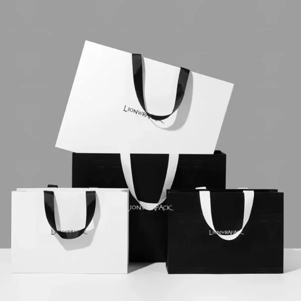 Sac en papier de luxe imprimé sac en papier cadeau de luxe Sac à vaisselle du logo OEM. Cet sac en papier en noir et blanc élégant combine l'esthétique minimaliste avec une texture premium, ce qui le rend parfait pour les marques de luxe, les magasins de détail, les emballages cadeaux et les boutiques. Avec de larges poignées de ruban et une construction renforcée, il assure à la fois la beauté et la force dans la présentation.
